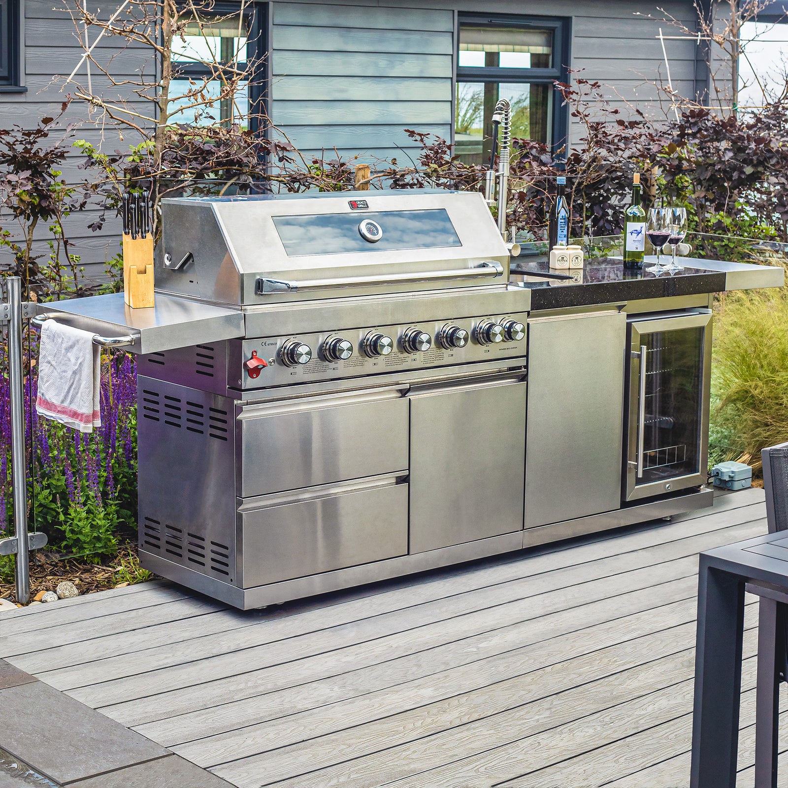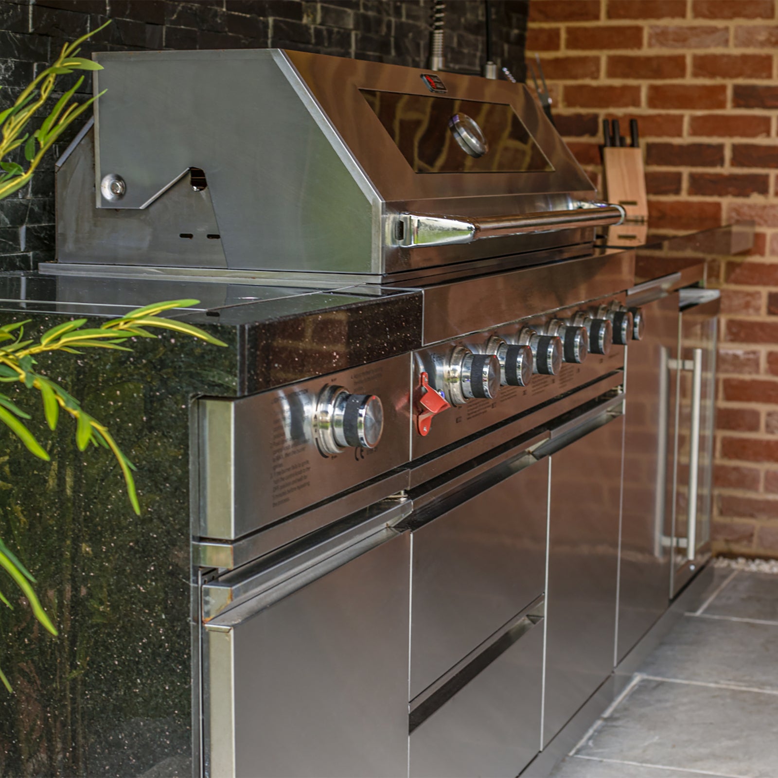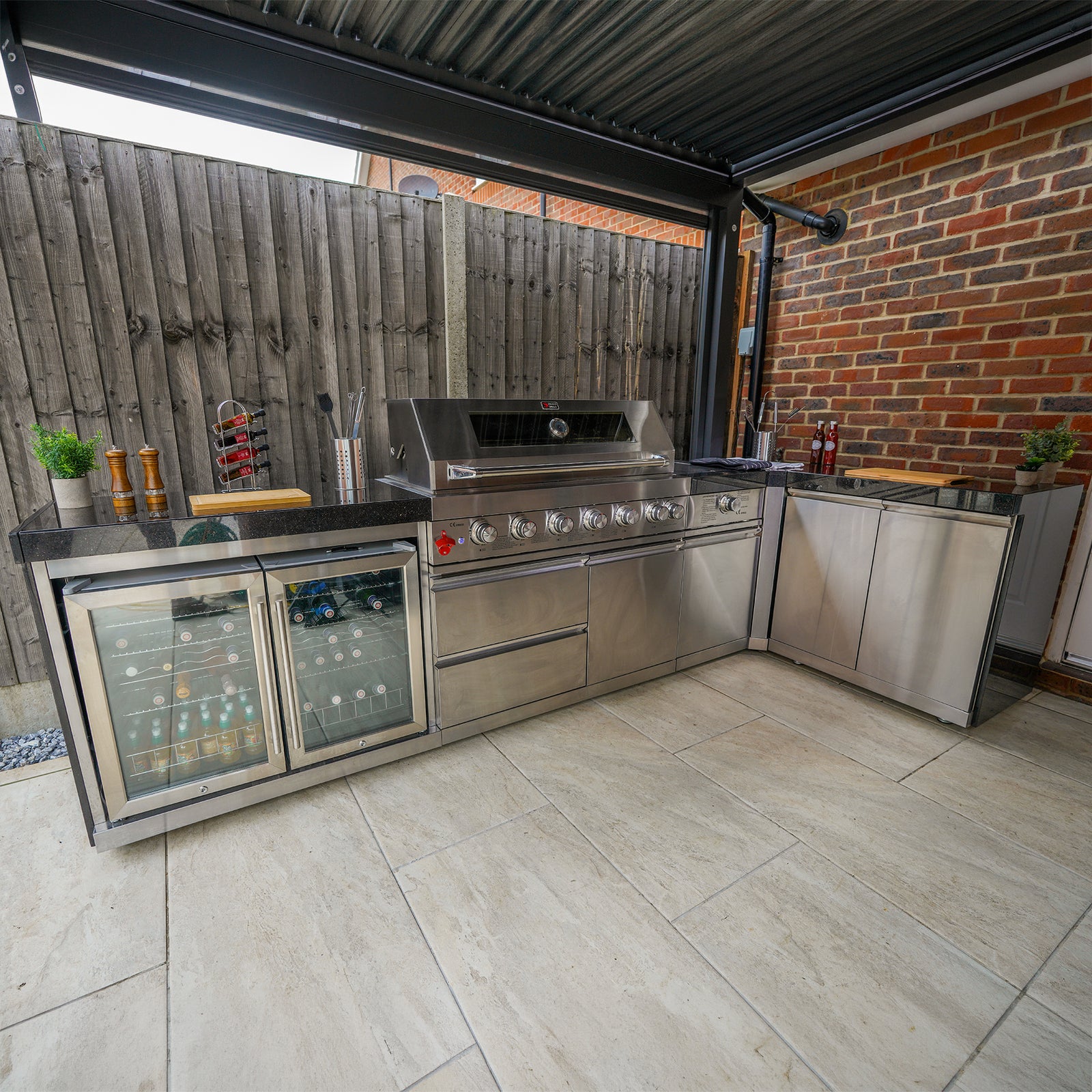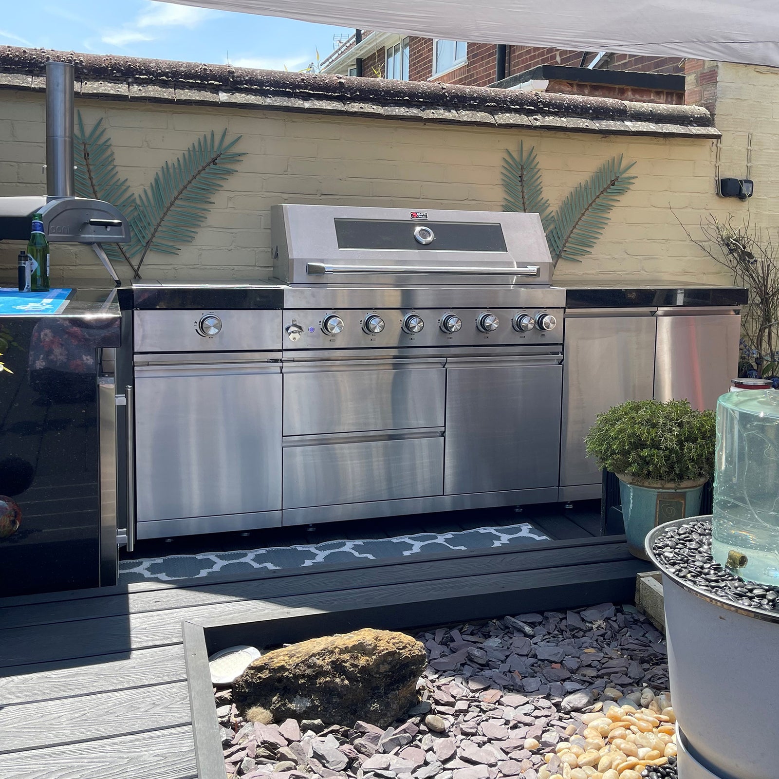 Situated at a hotel in County Durham, this small outdoor kitchen features the 6 Burner Gas BBQ with a sink & fridge unit.