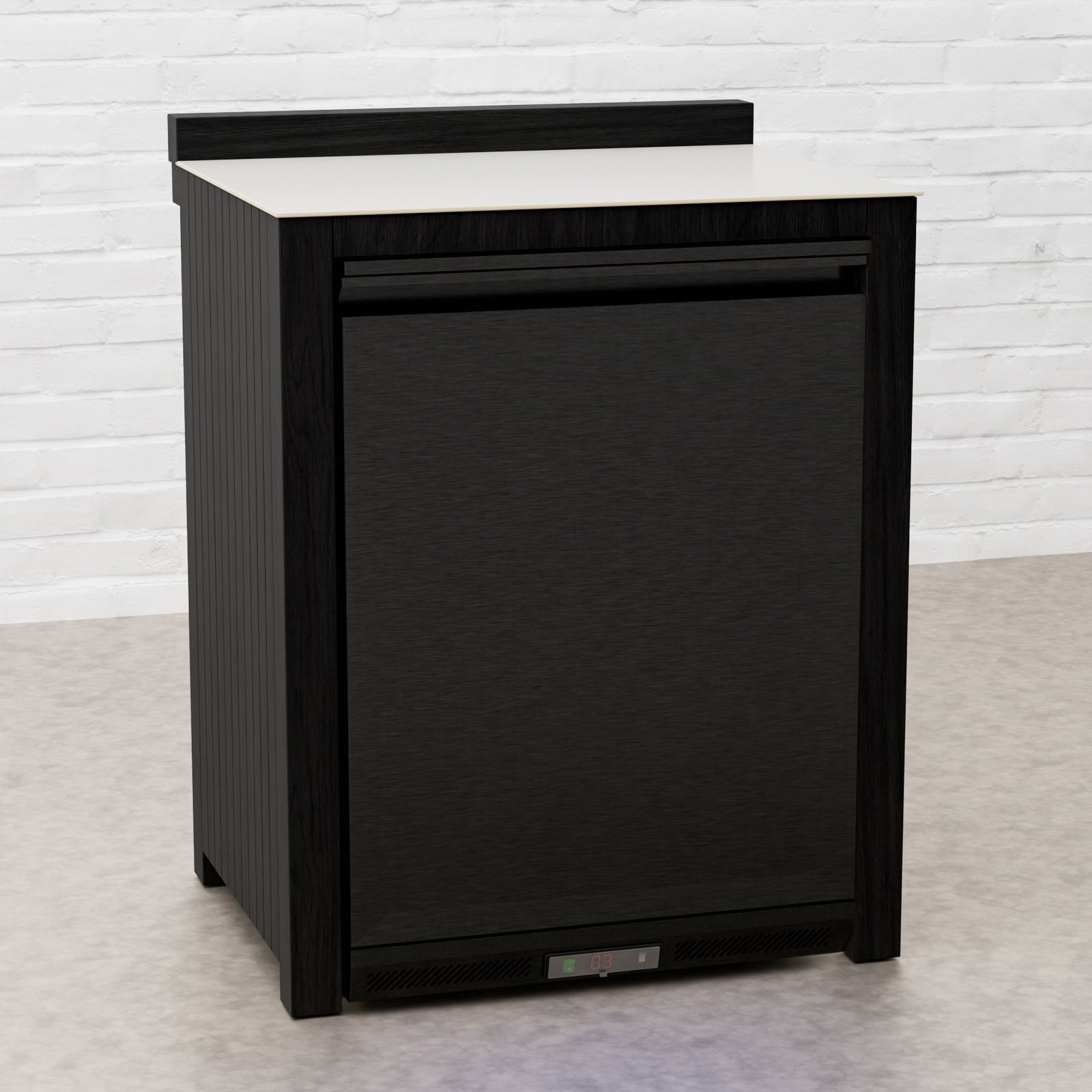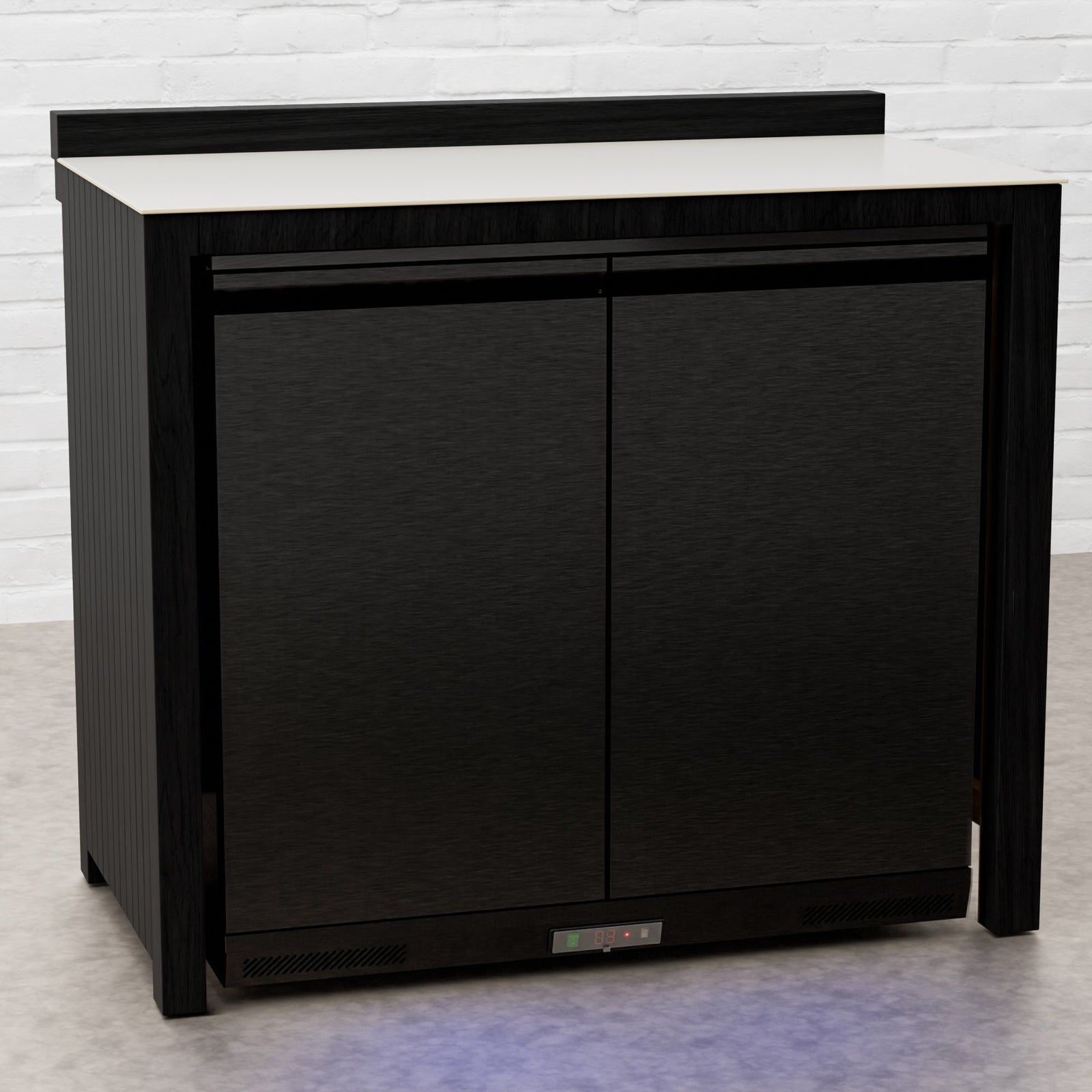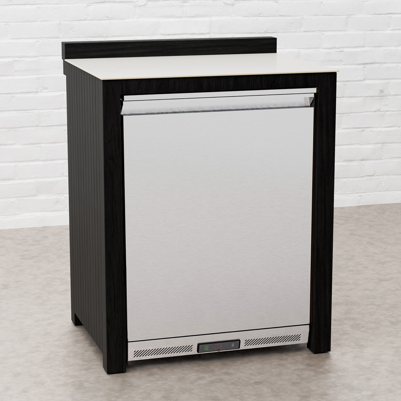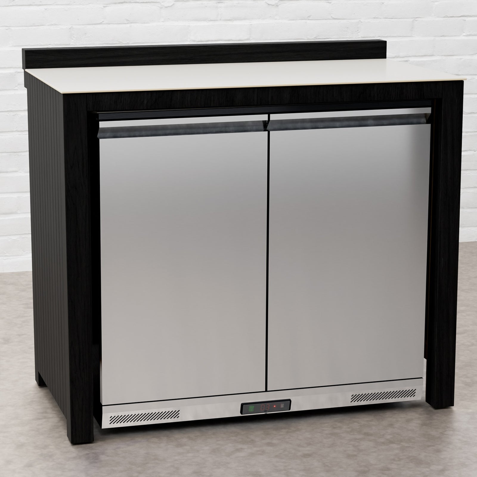 Every Carbon Line unit blends robust materials with practical design. Heavy-duty castor wheels with levelling feet make installation and adjustment simple, while clean black surfaces — paired with sintered stone or granite worktops depending on the module — create a cohesive, architectural aesthetic.