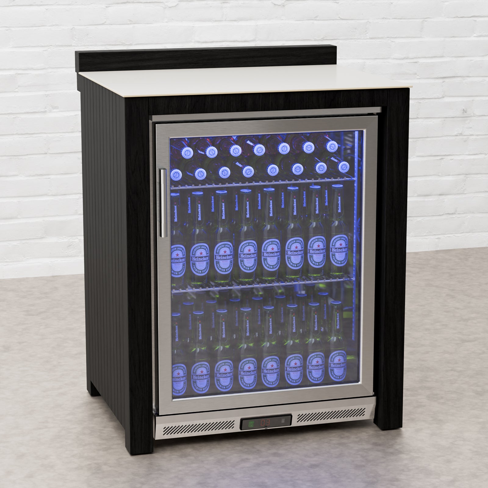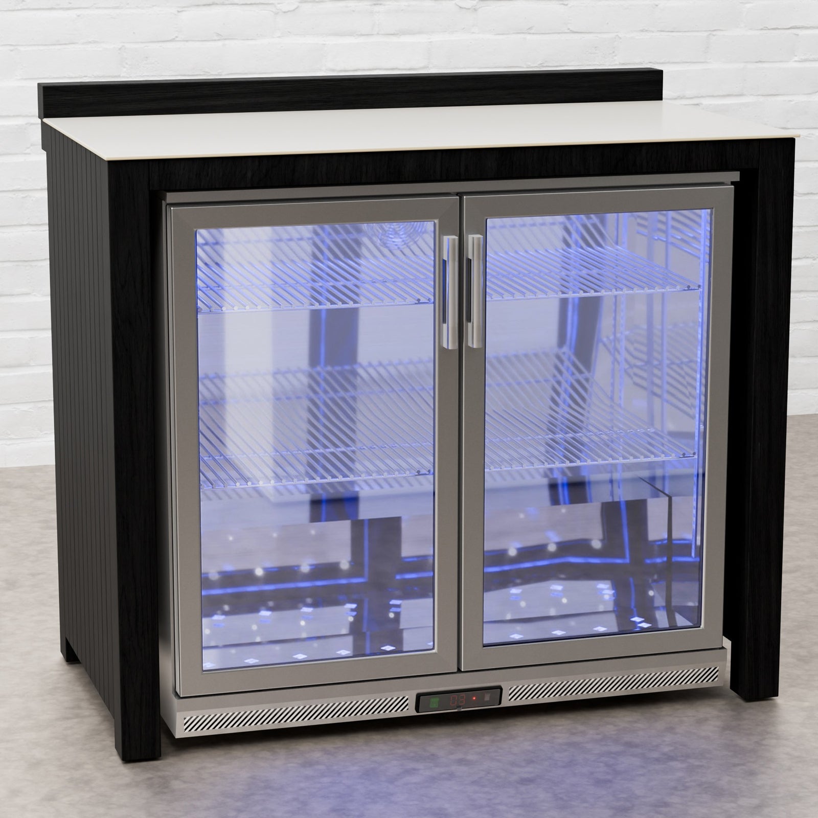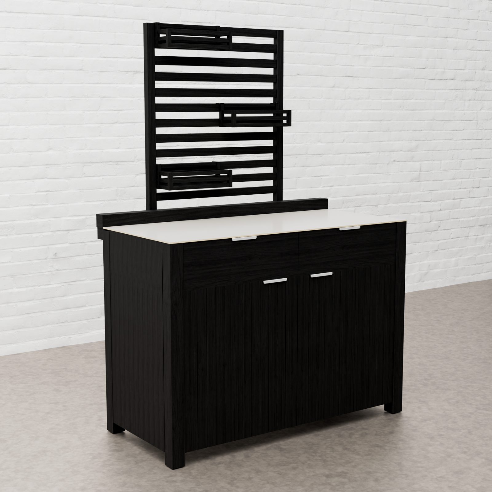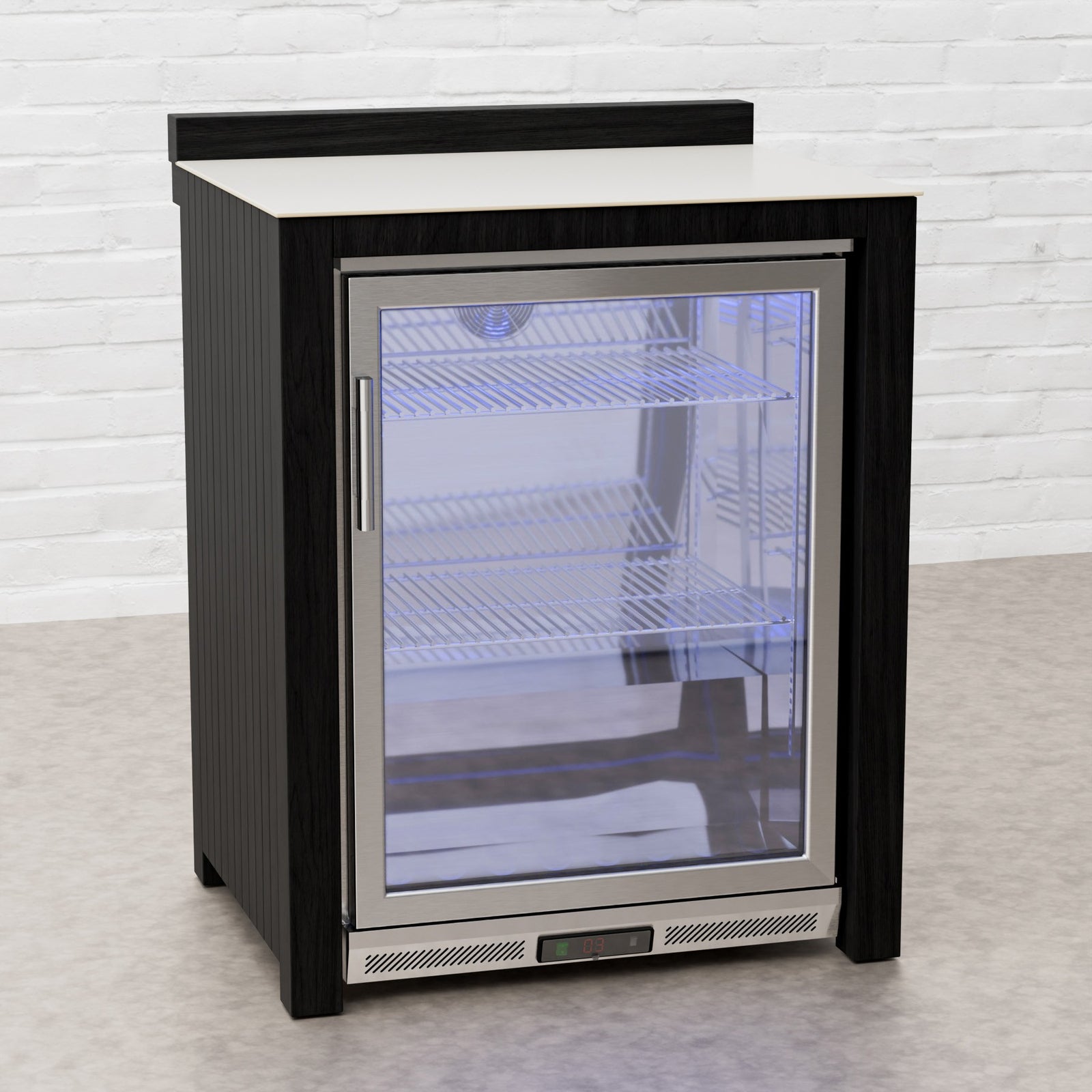 Every Carbon Line unit blends robust materials with practical design. Heavy-duty castor wheels with levelling feet make installation and adjustment simple, while clean black surfaces — paired with sintered stone or granite worktops depending on the module — create a cohesive, architectural aesthetic.