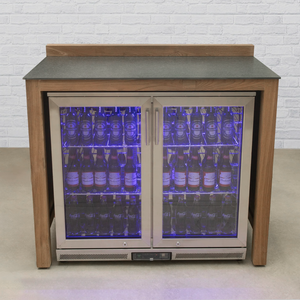 The Draco Grills Teak Modular Outdoor Kitchen Double Fridge Cabinet combines a beautifully crafted Reclaimed Teak housing unit with a double bar fridge, designed to elevate your outdoor entertaining experience. This setup not only enhances the aesthetic appeal of your garden with its sleek and modern design but also adds practical convenience, making it easier to host gatherings in style.